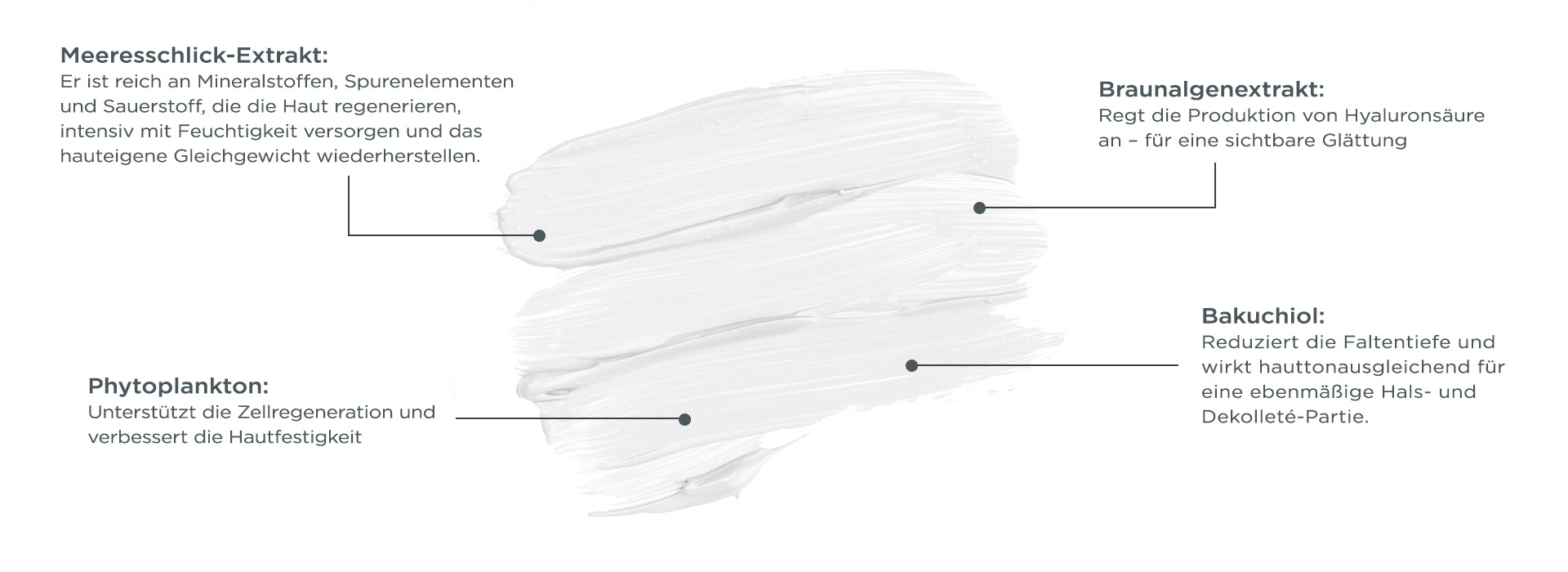 Im Zentrum der Pflege steht der exklusive Meeresschlick-Extrakt, ein wahres Multitalent aus dem Wattenmeer vor Cuxhaven. Er ist reich an Mineralstoffen, Spurenelementen und Sauerstoff, die die Haut regenerieren, intensiv mit Feuchtigkeit versorgen und das hauteigene Gleichgewicht wiederherstellen.
