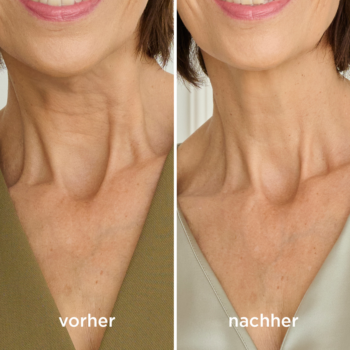 Im Gegensatz zum Gesicht wird der Hals in der täglichen Pflegeroutine oft vernachlässigt. Dabei ist die Haut dort besonders zart und weist weniger Talgdrüsen auf, was sie anfälliger für Trockenheit und Faltenbildung macht. Zudem sind wir im Alltag UV-Strahlen, Umwelteinflüssen und blauer Bildschirmstrahlung ausgesetzt – auch in diesen sensiblen Zonen. Das Ergebnis: Die Haut verliert an Spannkraft, wirkt knittrig und es entstehen vertikale Linien oder gar tiefe Falten.